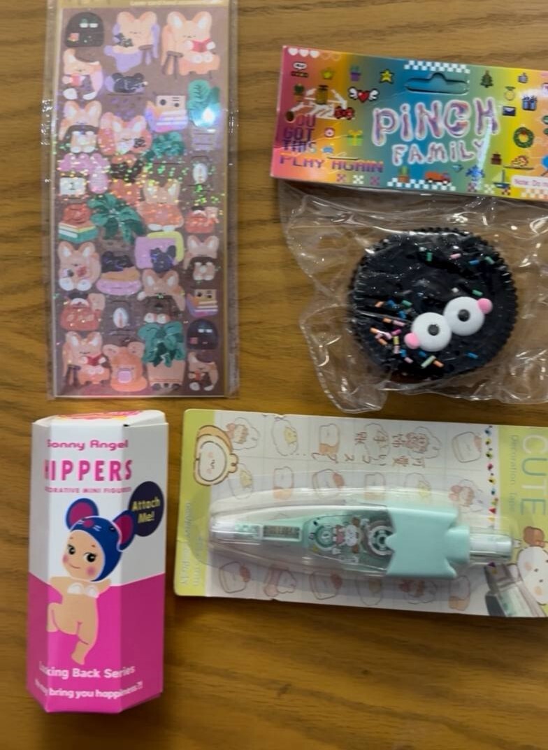 پک - 8 الی 9 آیتمی هست شامل: نرمالو و خودکار پاکن دار و فیگور و اسلایم 4 رنگ و رژ و دفترچه و گیره و استیکر شاین و یا استیک نوت شاین دار و مهر و یا چسب نواری و غلطگیر نواری و گیره و یا لگو میشه