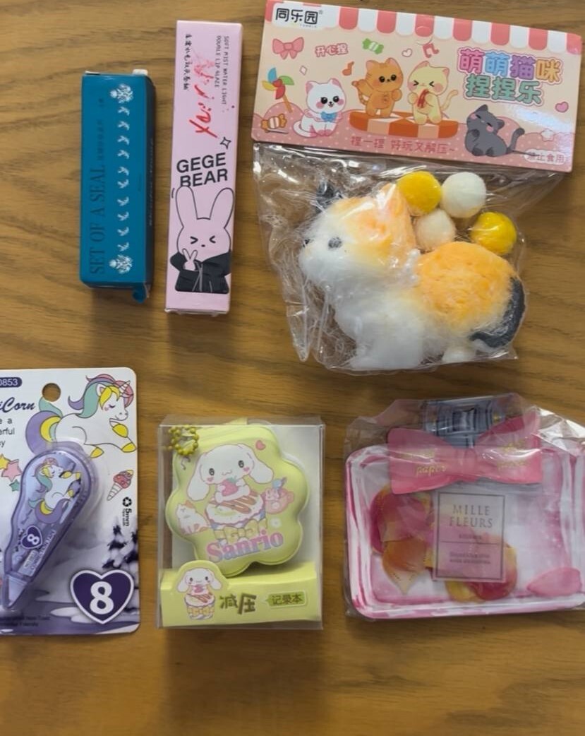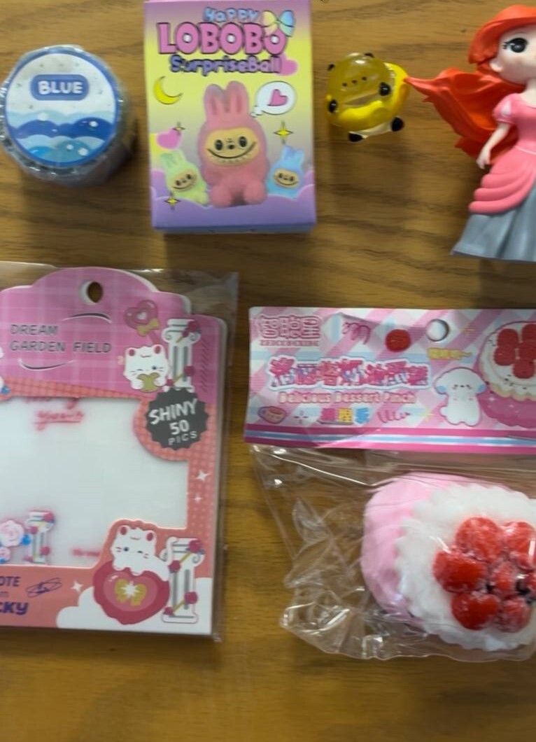 پک 6 الی 7 آیتمی هست شامل:نرمالو و فیگور و رژ و استیکر شاینی یا استیک نوت شاین دار و دفترچه حلقه ای و گیره و یا مینی لبوبو شانسی و یا چسب نواری و غلطگیر نواری و گیره و یا لگو میشه